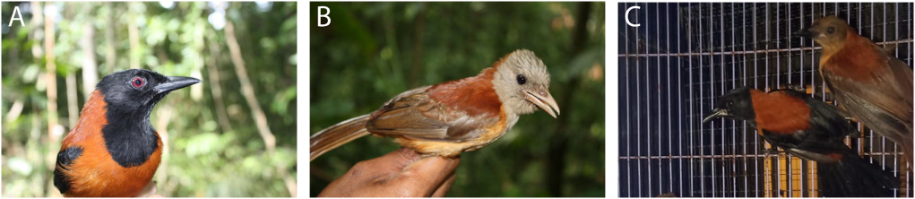 —(A) Hooded pitohui, (B) northern variable pitohui, and (C) southern variable pitohui (left). Images provided by Katerina Sam (A and B) and Carlos Gonzalez Bocos (C). —(A) Distribution of Pitohui dichrous, Pitohui kirhocephalus, and Pitohui uropygialis. Distribution maps were modified from the International Union for Conservation of Nature. The localities of our own field sampling and of museum specimens are depicted in black and red dots, respectively. (B) Phylogenomic analysis of a concatenated alignment of 5,795 genomic loci totaling 811,300 bp using RAxML, with nodal values indicating maximum likelihood bootstrap support for key nodes. Bird illustrations modified from del Hoyo et al. (2018).