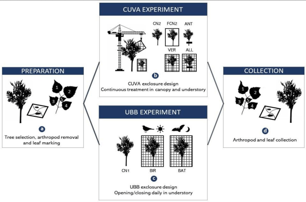 For example, we show that arthropods responded similarly to predator exclusion across forest strata, with a density increase of 81% on trees without vertebrates and 53% without both vertebrates and ants. Additionally, bird exclusion alone led to an 89% increase in arthropod density, while bat exclusion resulted in a 63% increase. All together, our results reveal that the effects of birds and bats on arthropod density and herbivory damage are similar between the forest canopy and understory in this temperate forest. In addition, ants were not found to be significant predators in our system. Furthermore, birds, bats, and ants appeared to exhibit antagonistic relationships in influencing arthropod density.