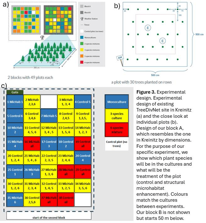 We established SpiDiv in 2024, according to the TreeDiv (Tree Diversity Network) designs. In our specific plots, we focus on the effect of spiders (Spi) along with diversity (Div) on the forest functioning. Over the years, we will focus on the effect of tree species diversity and spiders on productivity, above and belowground processes.