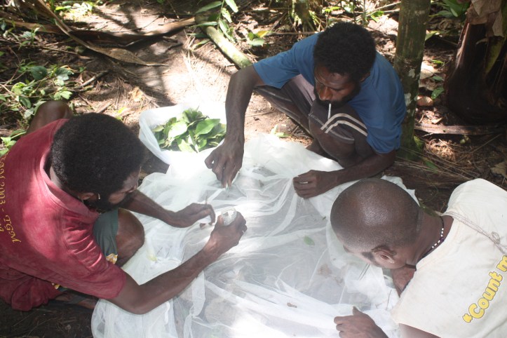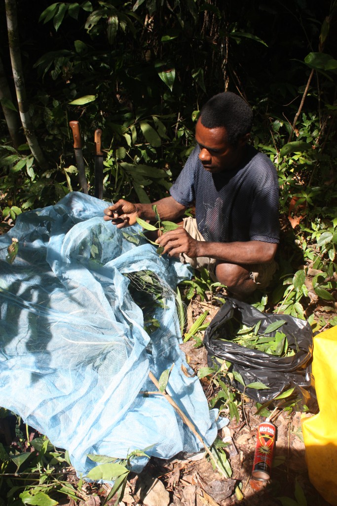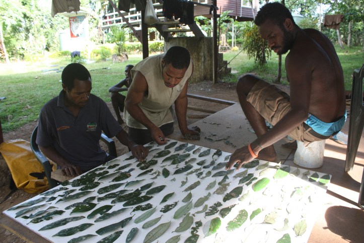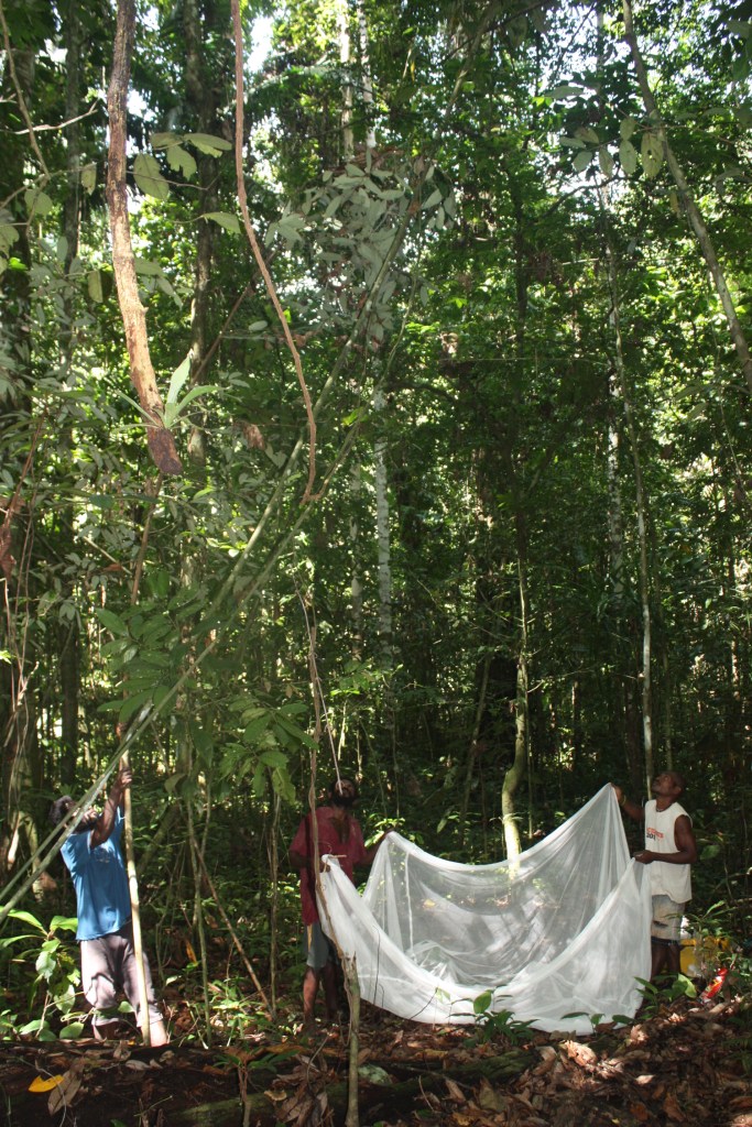 We started field work in early 2014 by selecting focal plant species. We decided for various Ficus sp., as they were already mapped and plotted at our study site. In March-May 2014, we set whole experiment: i.e. we protected 20 saplings against vertebrates, 20 saplings against ants, 20 saplings against ants + vertebrates, and we finally marked 20 saplings as a control. All this has been done at all eight study sites.At the same time, we conducted first survey of ants and birds at each study site. We spent June and July by work on database developing and entering first data, analyses of herbivory as measured at the beginning of the project. We (myself and my assistant Bonny Koane) went to present our first results to ATBC conference in Cairns. September and October 2014 was again devoted to field work and to first collections of insect and leaves.